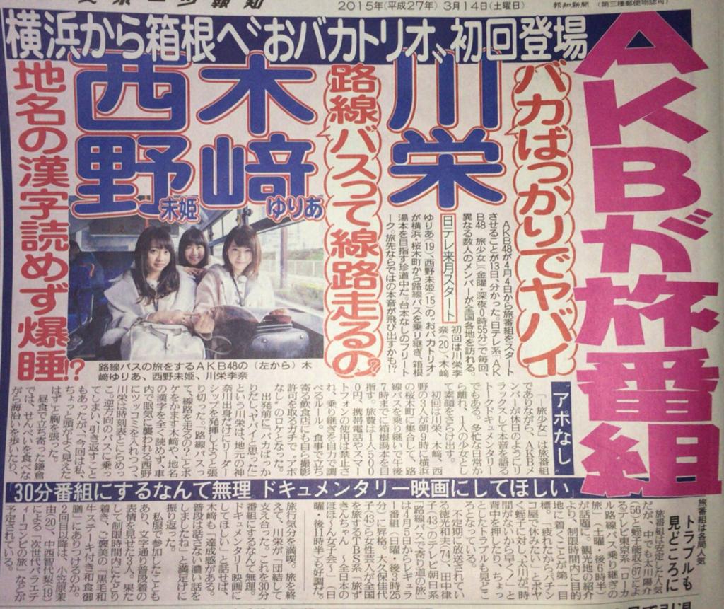 情報解禁になりました!「AKB48旅少女」土曜深夜放送です。初回は、4.4(土)。川栄李奈、木﨑ゆりあ、西野未姫、おバカ3人が路線バスで横浜から箱根を目指します! #ntv #AKB48 pic.twitter.com/LZxs1lp6dj