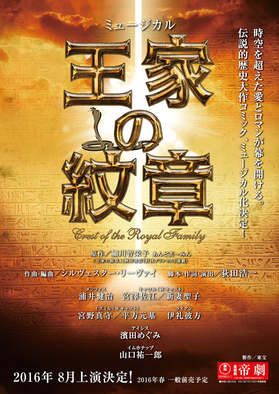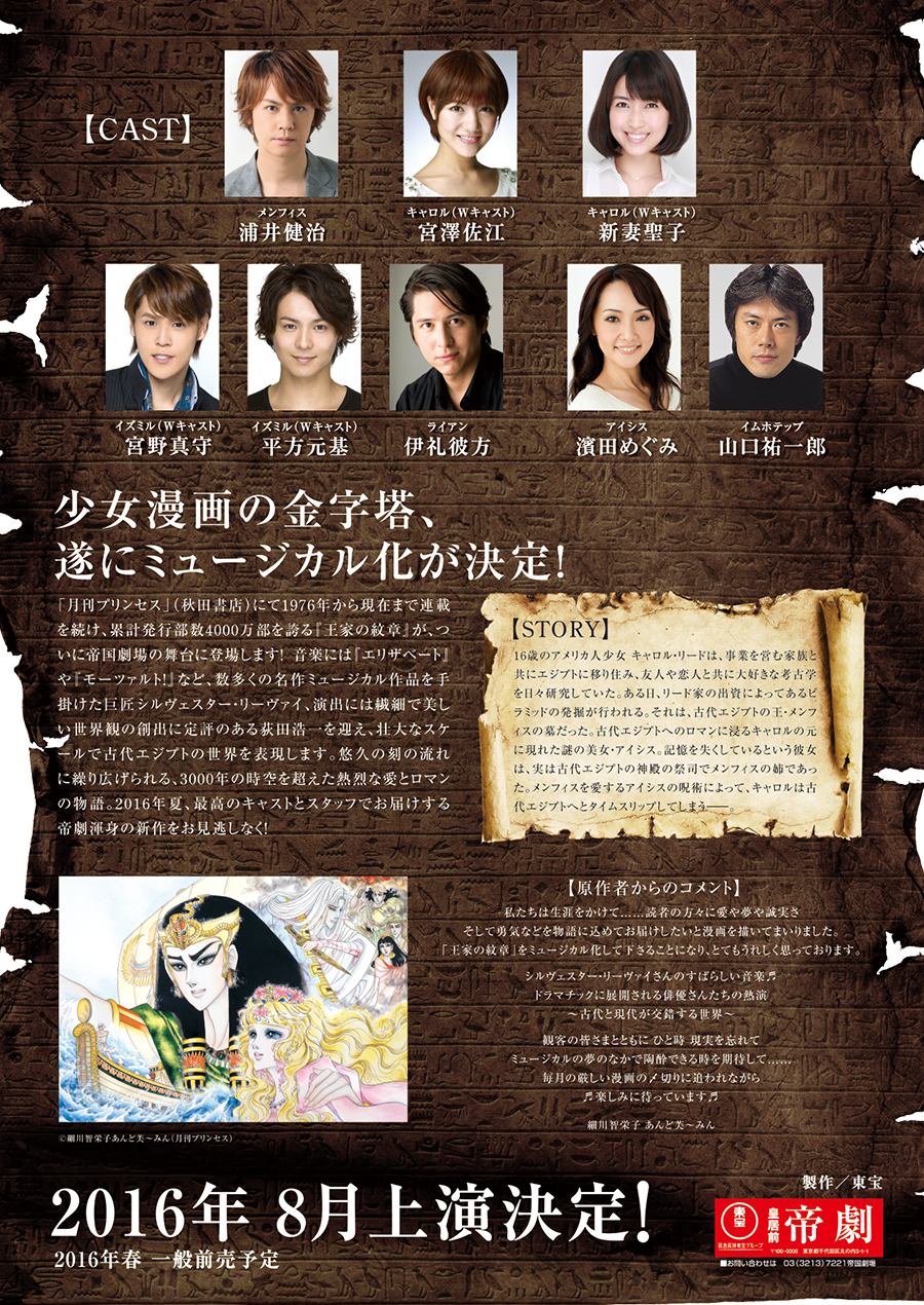 「王家の紋章」は1976年から連載中の人気少女漫画。考古学を学ぶ、明るく好奇心旺盛なキャロルが古代エジプトにタイムスリップし、若き王メンフィスと恋におち、エジプトと敵対するヒッタイト国王子やキャロル暗殺を狙う王の異母姉が絡む大河ロマン。累計4000万部を売り上げているが、これまで映像化、アニメ化はされておらず、今回が初舞台化となる。