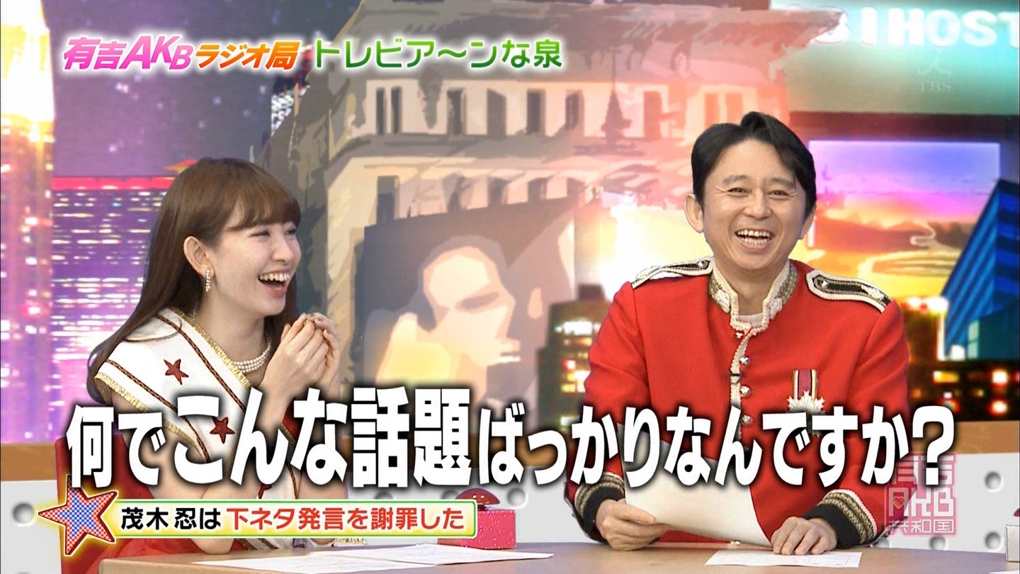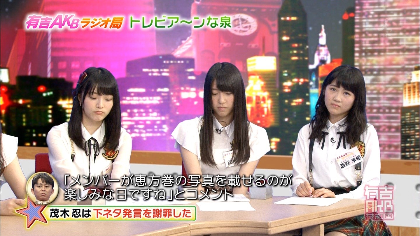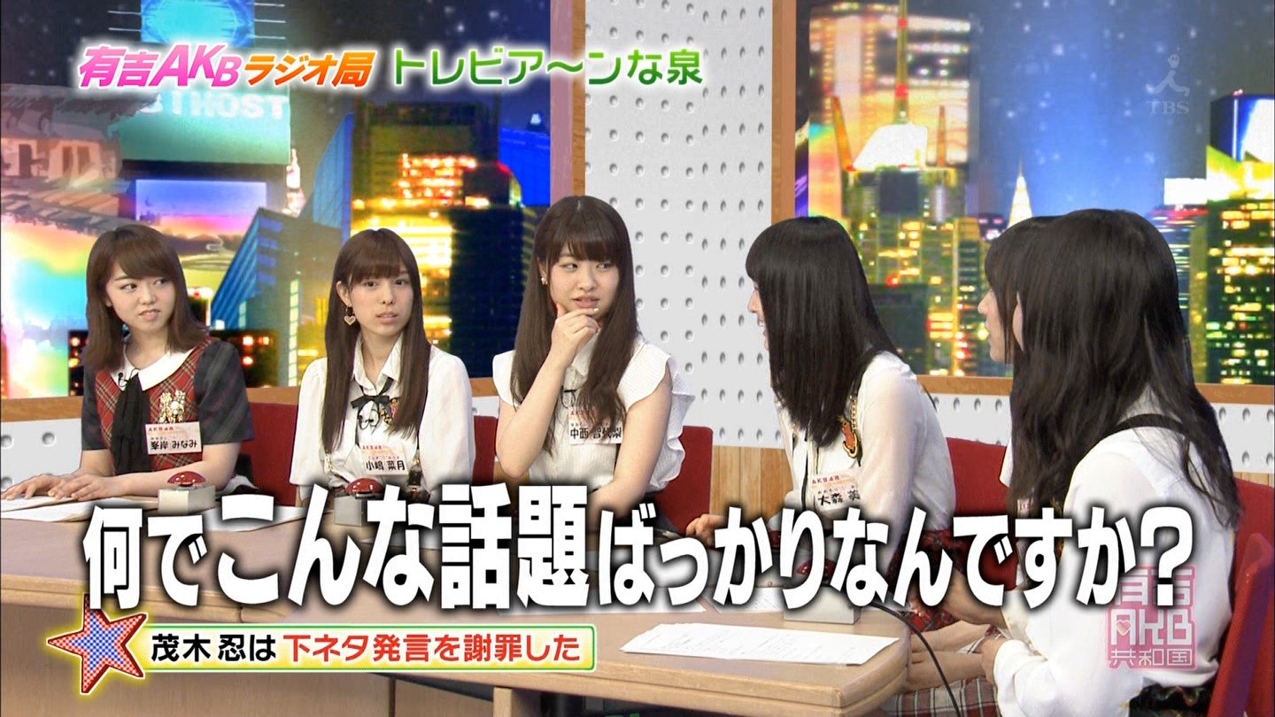13日深夜に放送された同番組では、中西智代梨は、お尻にしずく型の穴が開いているパンツや、黒いスケスケのレースのパンツを愛用している話。さらに、小嶋菜月が自身の胸が大きいために着物が苦しかった話。そして、茂木忍の写メ会では、「お触りコース」「もぎもぎコース」「個人プレイコース」がある話、西野美姫の胸が最近、大きくなってファンが反応している話などが話題になった。