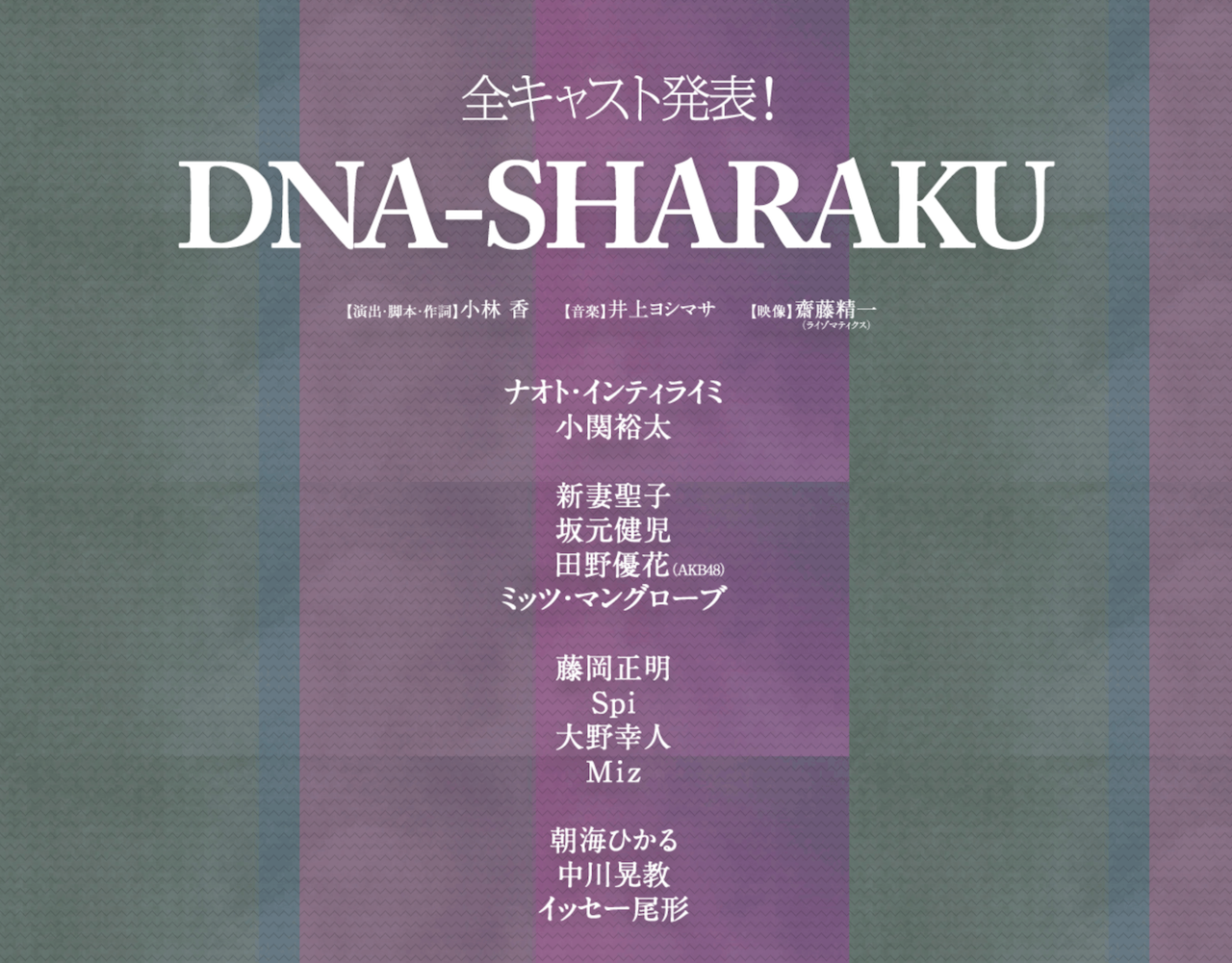 共演には、圧倒的な歌唱力と豊かな表現力でミュージカルを中心に活躍の場を広げている新妻聖子。劇団四季で培ってきた卓越した身体能力や歌唱力で強烈な存在感を放つ坂元健児。今年、オーディションで主役の座を射止めたミュージカル「WIZ」での好演が記憶に新しい田野優花、TV番組の司会やコメンテーター、さらに歌手活動で美声を響かせるミッツ・マングローブ、アーティストとしてもミュージカル俳優としても成長し続ける藤岡正明、幼少期から培った歌唱力や演技力で幅広い作品で活躍するSpi、得意とする幅広いジャンルのダンスパフォーマンスで縦横無尽に舞台を駆ける大野幸人、アーティストとして海外でも注目され、1年の休養後復帰第一弾舞台となるMiz、元宝塚トップスターで現在も舞台上でひときわ輝く存在感で活躍する朝海ひかる、数々の演劇賞を受賞し、今後の演劇界を背負っていく人物のひとり、中川晃教、一人芝居の第一人者であり現在もドラマ、映画等第一線で活躍するイッセー尾形と、この「DNA-SHARAKU」で描かれる「創造する心」の素晴らしさ、美しさを見事に体現する華も実力も兼ね備えたキャストたちが揃いました。