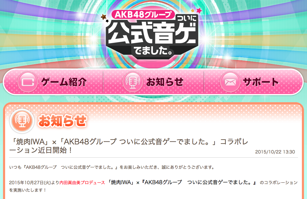 2015年10月27日(火)より内田眞由美プロデュース「焼肉IWA」×『AKB48グループ ついに公式音ゲーでました。』のコラボレーションを実施いたします!